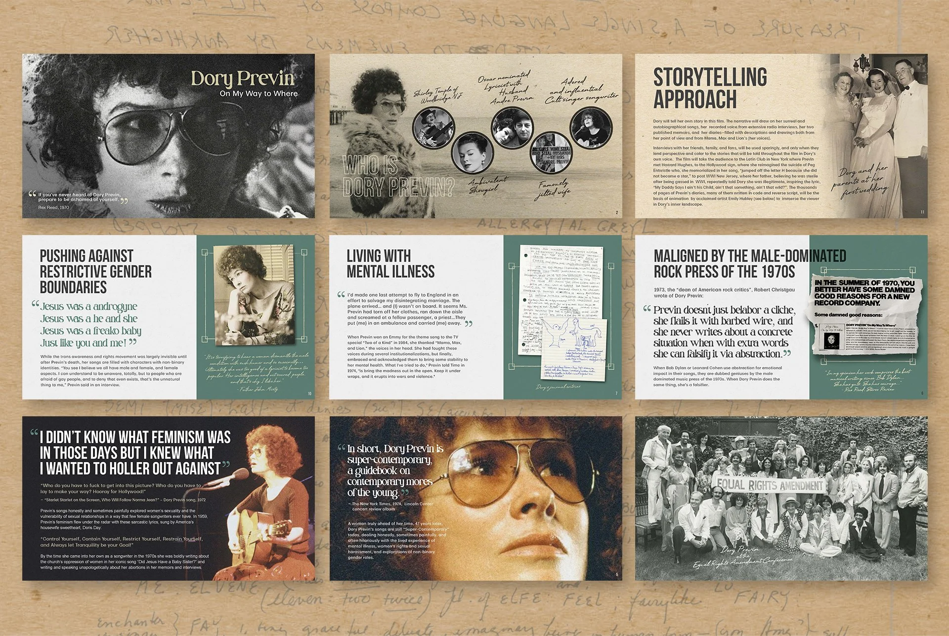 Dory Previn was an Oscar-nominated songwriter renowned for writing music for classic MGM films such as Valley of the Dolls in the 60s. Later on, she began playing and releasing her own music exploring women’s oppression, sexuality and mental illness. I had the opportunity to design multiple touch points to promote the film from the initial pitch deck to a book, social media, poster and website. Check out the website I created for the film here.